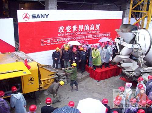 6300網(wǎng)記者現(xiàn)場(chǎng)報(bào)道:2007年12月10日,三一重工特邀行業(yè)領(lǐng)導(dǎo)、部分客戶及業(yè)界媒體齊聚上海環(huán)球金融中心施工現(xiàn)場(chǎng),共同觀摩三一重工的超高壓拖泵將混凝土一次泵送至492米的高空。刷新了三一重工自己在香港國(guó)際金融中心創(chuàng)造的406米世界紀(jì)錄,挑戰(zhàn)極限,再立標(biāo)桿。