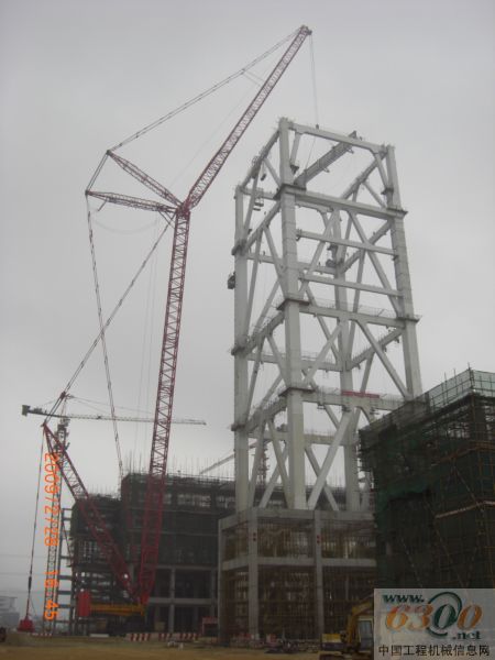 2009年2月12日,SCC9000履帶起重機以96m主臂+60 m副臂帶超起工況,作業(yè)半徑38m,吊裝設(shè)備:1000MW火力發(fā)電廠鍋爐立柱,設(shè)備重52t。