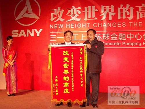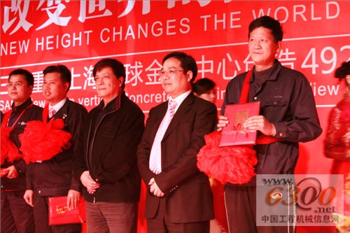 在主題會(huì)議現(xiàn)場(chǎng),上海建工集團(tuán)第一建筑有限公司副總經(jīng)理許建強(qiáng)向三一重工副總經(jīng)理周萬(wàn)春贈(zèng)送一面錦旗,感謝三一重工在施工中做出的努力。隨后,許建強(qiáng)和周萬(wàn)春又向一直戰(zhàn)斗在上海環(huán)球金融中心施工一線(xiàn)的三一重工4位服務(wù)工程師、上海一建4位超高壓拖泵操作手頒發(fā)了榮譽(yù)錦旗。