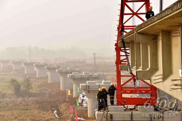 1月18日,中鐵十一局職工在湖北省天門市境內安裝江漢平原貨運鐵路一期工程姚家河大橋第一片橋梁。新華社記者 杜華舉 攝