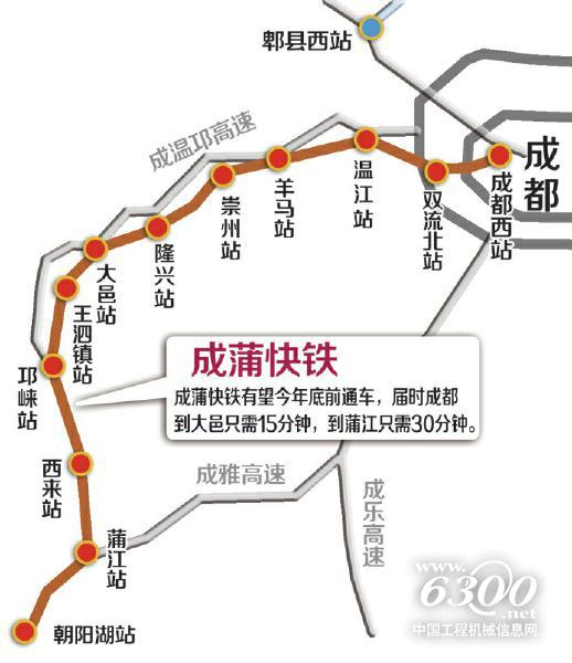 根據(jù)規(guī)劃,成蒲鐵路線路由成都西引出,經(jīng)溫江、崇州、大邑、邛崍、蒲江至蒲江朝陽湖,沿線設(shè)成都西、雙流北、溫江、羊馬、崇州、隆興、大邑、王泗鎮(zhèn)、邛崍、西來、蒲江、朝陽湖12個站。該鐵路設(shè)計為客運專線,全長約99公里,新建雙線,標(biāo)準(zhǔn)為Ⅰ級電氣化鐵路。列車設(shè)計最高時速200公里,預(yù)計今年年底通車運行。目前,溫江站站點建設(shè)正在加緊進(jìn)行,而大邑境內(nèi),成蒲鐵路特大橋的澆筑已進(jìn)入施工尾期。