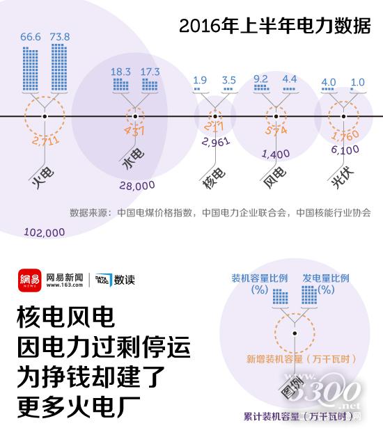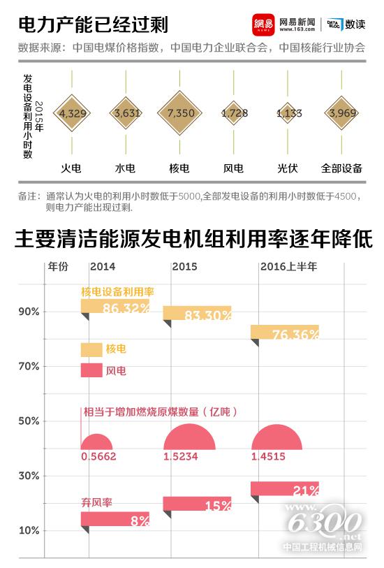 根據(jù)中國電力企業(yè)聯(lián)合會的數(shù)據(jù),今年上半年核電設(shè)備平均利用率僅為76.36%,在投入運行的 30臺機組中近半利用率低于75%,其中紅沿河核電廠的三號機組利用率僅為38.14%。無獨有偶,另一種清潔能源——風電也難逃同樣的命運。2016年上半年風力大省甘肅和新疆的棄風率均高于45%,全國風電棄風率也達到了21%的新高,這相當于增加燃燒了1.45億噸原煤。除去產(chǎn)能過剩的原因,棄核棄風的另一個重要的目的是為火電讓路。