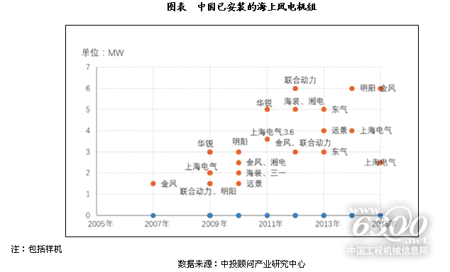 中國(guó)海上風(fēng)電的發(fā)展離不開(kāi)海上風(fēng)電機(jī)組的突破創(chuàng)新。中國(guó)海上風(fēng)電從2007年起,在渤海灣安裝一臺(tái)金風(fēng)(GW70/1500)試驗(yàn)樣機(jī);2009年至2010年,龍?jiān)唇K如東潮間帶試驗(yàn)32.5兆瓦風(fēng)電場(chǎng)建成,共8家安裝了實(shí)驗(yàn)樣機(jī)(金風(fēng)GW90 /2500,華銳SL3000/113,聯(lián)合動(dòng)力UP1500-82,明陽(yáng)MY1.5s-82和SCD3.0-100,上海電氣W2000-93,遠(yuǎn)景 EN-82/1.5,海裝H93-2.0MW,三一SE9320III-S3)。2010年,東海大橋102兆瓦海上風(fēng)電場(chǎng)(華銳SL3000/90),標(biāo)志著中國(guó)首個(gè)真正意義上的海上風(fēng)電場(chǎng)建成。