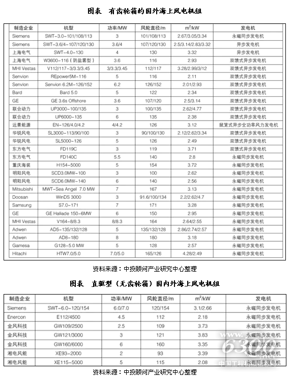 國(guó)外的海上風(fēng)電機(jī)組,可看出大功率風(fēng)電機(jī)組增多,如:6MW、7MW和8MW等,且均已經(jīng)進(jìn)入商業(yè)化運(yùn)營(yíng)階段,10MW風(fēng)電機(jī)組也有了實(shí)驗(yàn)樣機(jī)。從已經(jīng)安裝的海上風(fēng)電機(jī)組看,同樣傳動(dòng)系統(tǒng)為帶齒輪箱的占多數(shù),直驅(qū)較少。由此可見(jiàn),大功率海上風(fēng)電機(jī)組是趨勢(shì),而中國(guó)的海上風(fēng)電機(jī)組究其如何發(fā)展,讓我們拭目以待。
