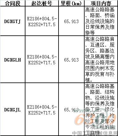 大廣高速公路息縣段、息光段起訖樁號為K2186+804.5~K2252+717.5,全長65.913公里,本次施工招標(biāo)范圍為大廣高速公路息縣段、息光段高速公路土建、綠化及交通安全設(shè)施的維修保養(yǎng),共分為兩個合同段。施工監(jiān)理招標(biāo)劃分為一個合同段,具體標(biāo)段劃分及施工內(nèi)容見下表: