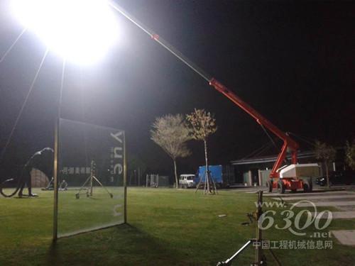 攝影組人員在高空作業(yè)平臺上攜帶一超大燈光照亮了整個月湖公園美術(shù)館,