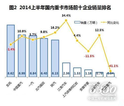 排位第六至第十的企業(yè)依次是江淮汽車、上汽依維柯紅巖、安徽華菱、大運汽車和北奔重汽,其上半年銷量均低于2.4萬輛,與前五企業(yè)差距懸殊。其中,江淮汽車表現(xiàn)較好,銷量同比增長34.4%至2.36萬輛。大運汽車也有12.5%的增長,銷量實現(xiàn)7945輛。
