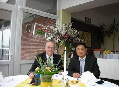 在阿特拉斯公司舉辦的歡迎宴會(huì)上,陳正利秘書(shū)長(zhǎng)與德國(guó)阿特拉斯公司總經(jīng)理魏爾德先生合影