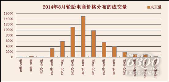 2014年8月,線上輪胎的銷售價格基本維持不變,從150元到1500元不等,而200-500元的輪胎價格區(qū)間依舊最受消費者歡迎,相較于上月變化不大。本月輪胎200-300元、300-400元的成交量大破10000件大關(guān),300-400元的輪胎銷量更是突破15000件。由此看出,平民化的價格仍然最受消費者的歡迎。