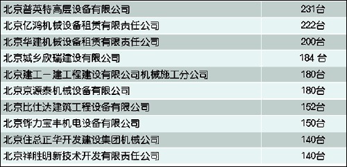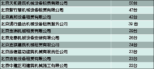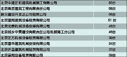 注: 市場(chǎng)占有量是按照租賃企業(yè)在北京市建委登記編號(hào)的設(shè)備數(shù)量進(jìn)行統(tǒng)計(jì)排序的,在數(shù)量相同或接近時(shí),考慮了設(shè)備的大小暨起重能力,并分設(shè)備類型進(jìn)行的排序。