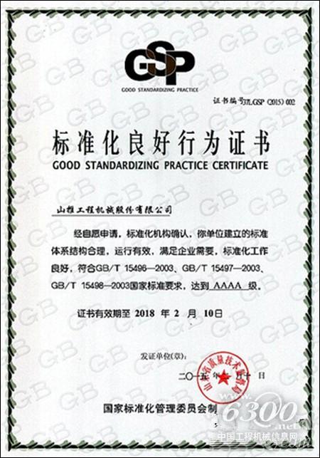 山推獲得省質(zhì)監(jiān)局標(biāo)準(zhǔn)化良好行為AAAA證書(shū)