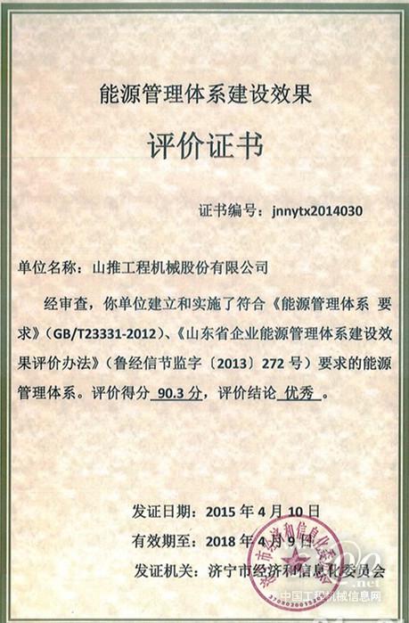 濟寧市經(jīng)濟和信息化委員會正式向山推頒發(fā)《能源管理體系建設效果評價證書》,評價得分90.3分,評價結論為優(yōu)秀。