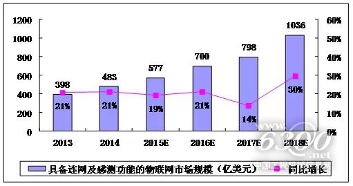 2014年,IC Insights數據顯示具備連網及感測系統功能的物聯網整體產值約483億美元,同比增長21%,到2018年規(guī)??赏_到1036億美元,2013年至2018年復合成長率也將達21%。