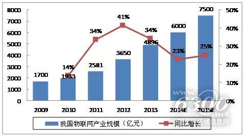 據工業(yè)和信息化部數據,2014年我國整個物聯網的銷售收入達到6000億元以上。近幾年我國物聯網產業(yè)發(fā)展的綜合增長率達到了30%以上,充分體現了其強勁的發(fā)展勢頭。尤其是智能制造領域的工業(yè)物聯網以及智能交通領域的車聯網,市場前景良好,增長速度不斷攀升。