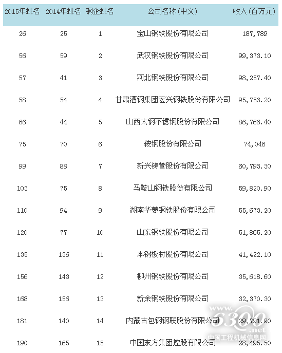 7月8日,財(cái)富中文網(wǎng)發(fā)布2015年中國(guó)500強(qiáng)企業(yè)名單,本排行榜覆蓋范圍包括在中國(guó)境內(nèi)外上市的所有中國(guó)公司,所依據(jù)數(shù)據(jù)為上市公司在各證券交易所正式披露信息。其中寶山鋼鐵股份有限公司以2014年?duì)I業(yè)收入1877.89億元位列第26名,也是唯一入圍財(cái)富中國(guó)500強(qiáng)前50強(qiáng)的鋼企,緊隨其后為武漢鋼鐵股份有限公司和河北鋼鐵股份有限公司,分別位列56和57名。