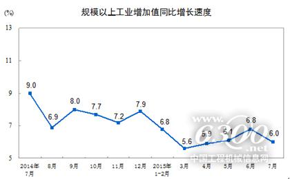 2015年7月份,規(guī)模以上工業(yè)增加值同比實(shí)際增長6.0%(以下增加值增速均為扣除價(jià)格因素的實(shí)際增長率),比6月份回落0.8個(gè)百分點(diǎn)。從環(huán)比看,7月份,規(guī)模以上工業(yè)增加值比上月增長0.32%。1-7月份,規(guī)模以上工業(yè)增加值同比增長6.3%。