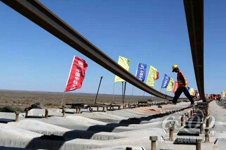 △2015年9月5日,鐵路建設(shè)者在額哈鐵路建設(shè)工地鋪設(shè)最后一組鋼軌。