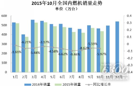 根據(jù)中國內(nèi)燃機工業(yè)協(xié)會《中國內(nèi)燃機工業(yè)銷售月報》重點企業(yè)數(shù)據(jù)顯示,2015年10月完成內(nèi)燃機銷量 436.82萬臺,環(huán)比下降7.05%,同比下降5.97%;1-10月銷量累計完成4693.23萬臺,同比累計下降5.01%;10月完成18224.35萬千瓦,環(huán)比增長6.24%,同比增長7.66%,1-10月累計完成171509.8萬千瓦,同比累計增長2.08%。乘用車市場迎來全年黃金銷售期,累計銷量遠好于行業(yè)平均水平,同比累計增長4.61%;受國2升國3影響,柴油機市場10月的銷量明顯不如上月,同比累計降幅維持在14.51%。