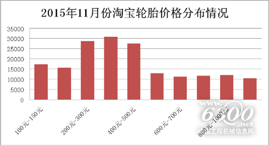 2015年11月份,線(xiàn)上輪胎的銷(xiāo)售價(jià)格基本維持不變,從150元到1500元不等,而200-500元的輪胎價(jià)格區(qū)間依舊最受消費(fèi)者歡迎,相較于上月變化不大。本月輪胎300-400元的成交量突破30000件大關(guān)。由此看出,平民化的價(jià)格仍然最受消費(fèi)者的歡迎。
