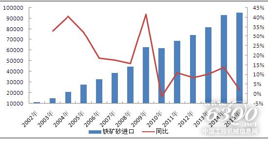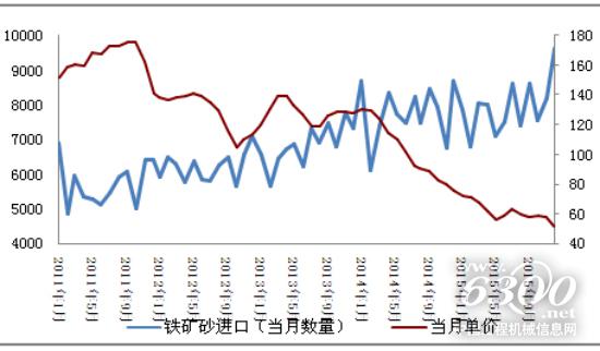 2015年我國累計出口鋼材11240萬噸,較上年增加1862萬噸,同比增長19.9%;累計進口鋼材1278萬噸,較上年下降165萬噸,同比下降11.4% 。2015年我國累計進口鐵礦石95272萬噸,較上年增加2021萬噸,同比增長2.2%。2015年全年鐵礦石進口單價60.5美元/噸,同比下降39.77% 。