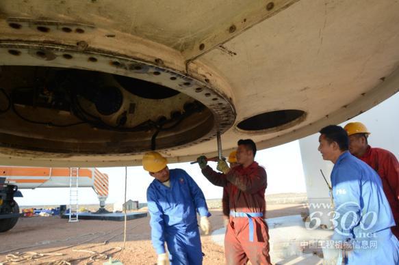 新疆哈密苦水風電場是無人區(qū),只有無盡的戈壁黃沙,離最近的小鎮(zhèn)也有百余公里,風暴肆虐,現(xiàn)場作業(yè)環(huán)境極其艱苦,但中聯(lián)重科QAY2000服務團隊以“客戶至上”為出發(fā)點,克服重重困難,第一時間派出了由產(chǎn)品項目經(jīng)理牽頭的電氣、液壓、結(jié)構(gòu)、傳動等各專業(yè)線研發(fā)工程師組成專項服務團隊指導安裝。