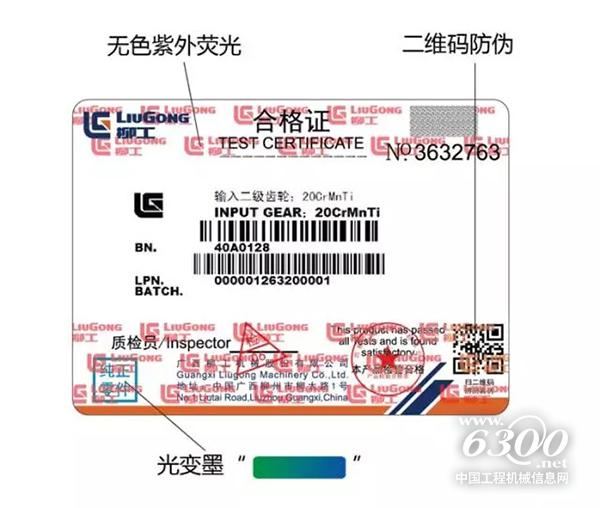 我們一起來看看如何通過防偽標(biāo)貼辨真?zhèn)?。下圖即為柳工配件最新防偽標(biāo)貼, 使用了光變墨、無色紫外熒光、二維碼等三種防偽技術(shù)以進(jìn)一步提高仿制難度: