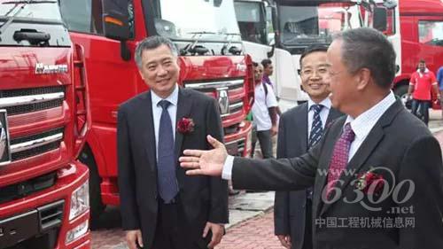 徐工汽車事業(yè)部總經(jīng)理羅東海(左)、進(jìn)出口公司副總經(jīng)理扈向陽(中)向客戶介紹漢風(fēng)系列卡車?