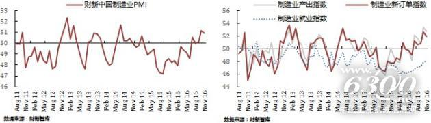 2016年11月統(tǒng)計(jì)局制造業(yè)PMI為51.7%,比上月上升0.5個(gè)百分點(diǎn),延續(xù)上行走勢(shì),并創(chuàng)逾兩年新高;非制造業(yè)商務(wù)活動(dòng)指數(shù)為54.7%,比上月上升0.7個(gè)百分點(diǎn),連續(xù)三個(gè)月上升,為2014年7月以來(lái)的高點(diǎn),非制造業(yè)延續(xù)了平穩(wěn)較快的增長(zhǎng)勢(shì)頭,增速進(jìn)一步加快。統(tǒng)計(jì)局PMI與財(cái)新PMI表現(xiàn)高度一致,11月經(jīng)濟(jì)繼續(xù)回暖。