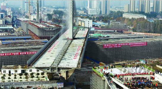 近日,在歐維姆公司2臺(tái)350噸連續(xù)轉(zhuǎn)體千斤頂?shù)臓恳?,?dāng)今世界轉(zhuǎn)體重量最大的斜拉橋-山東菏澤丹陽(yáng)路立交橋逆時(shí)針靈活轉(zhuǎn)動(dòng)。歷時(shí)80分鐘,橋體轉(zhuǎn)動(dòng)81.67度,平穩(wěn)跨越京九鐵路、新兗鐵路,與東西兩側(cè)橋梁精準(zhǔn)對(duì)接。