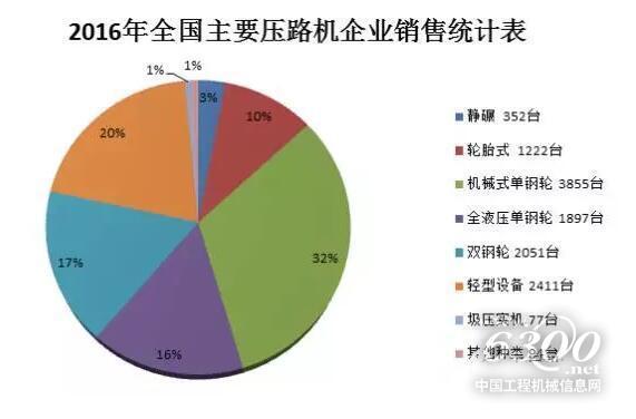 根據(jù)中國工程機械工業(yè)協(xié)會路面與壓實機械分會統(tǒng)計,2016年全年參加統(tǒng)計的23家主要企業(yè)共銷售壓路機11959臺,同比2015年的10388臺增長15%。包括:靜碾352臺,輪胎式1222臺,機械式單鋼輪3855臺,全液壓單鋼輪1897臺,雙鋼輪2051臺,輕型設(shè)備2411臺,垃圾壓實機77臺,其他種類94臺。