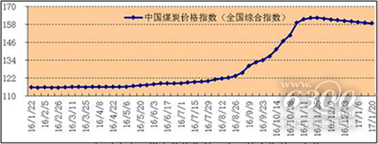中國(guó)煤炭?jī)r(jià)格指數(shù),引用自國(guó)家煤炭工業(yè)網(wǎng)。從圖中可見(jiàn)煤炭?jī)r(jià)格在16年9月份后大幅上揚(yáng),在17年1月份時(shí)出現(xiàn)回落。