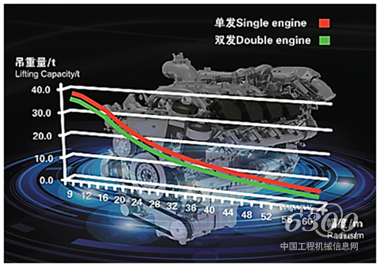 單發(fā)動(dòng)機(jī)系統(tǒng),整車(chē)共用一臺(tái)發(fā)動(dòng)機(jī),即將底盤(pán)動(dòng)力通過(guò)傳動(dòng)軸傳遞至上車(chē),結(jié)構(gòu)簡(jiǎn)單,可靠性高,故障率更低。XCA450采用G一代單發(fā)動(dòng)機(jī)傳動(dòng)技術(shù),整機(jī)降重約800kg,節(jié)約的重量被合理的分配到吊臂等關(guān)鍵結(jié)構(gòu)件上,作業(yè)性能提升5%