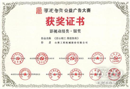 近期,山東省2016年“厚道魯商”公益廣告大賽獲獎名單放榜公布,山推股份公司參賽作品《匠心精工 厚道魯商》摘獲影視動漫類銀獎。