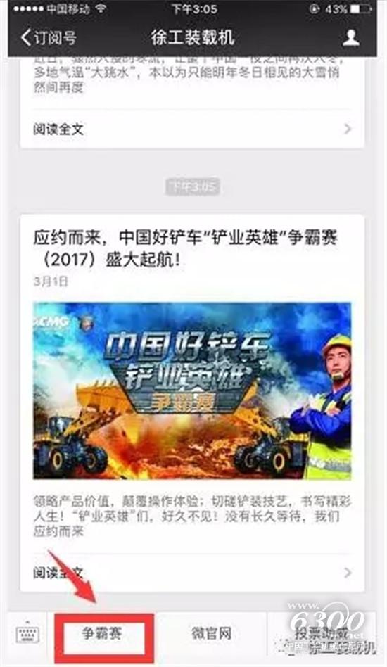 2、直接點(diǎn)擊“徐工裝載機(jī)”微信公眾平臺(tái)下“爭(zhēng)霸賽專題”,點(diǎn)擊“我要報(bào)名”參與報(bào)名;