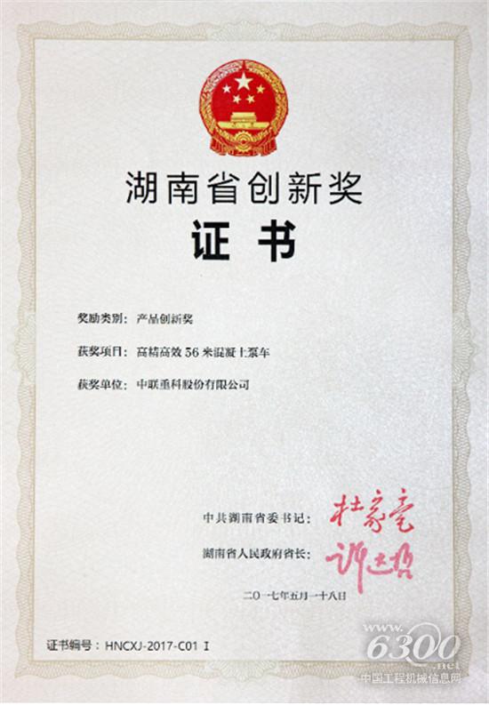 中聯(lián)重科“高精高效56米混凝土泵車”摘得湖南省首屆創(chuàng)新獎(jiǎng)
