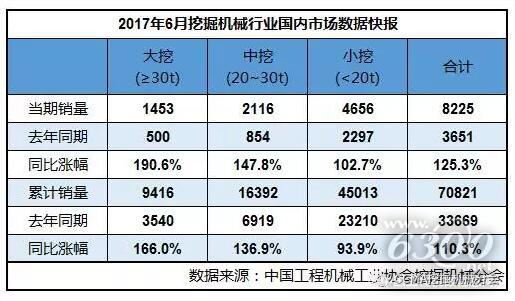 根據(jù)中國工程機械工業(yè)協(xié)會挖掘機械分會行業(yè)統(tǒng)計,2017年6月納入統(tǒng)計的26家主機制造企業(yè),共計銷售各類挖掘機械產(chǎn)品8933臺,同比漲幅100.8%。