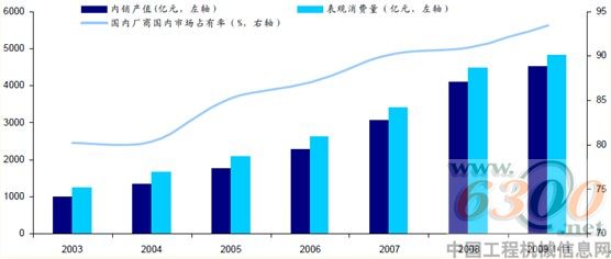 隨著國(guó)內(nèi)廠商技術(shù)實(shí)力的不斷提高,國(guó)內(nèi)廠商在國(guó)內(nèi)市場(chǎng)占有率2009 年已接近94%,外資品牌主要在高端產(chǎn)品方面還有一定優(yōu)勢(shì),國(guó)內(nèi)產(chǎn)品已基本能滿足國(guó)內(nèi)需求,僅少量高端產(chǎn)品依賴進(jìn)口。