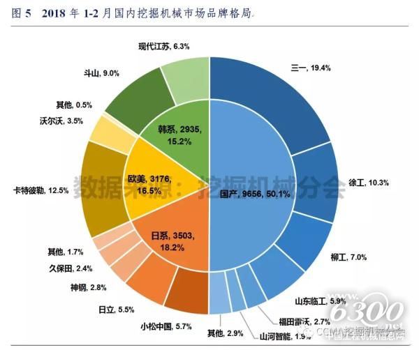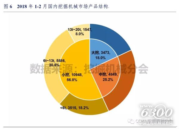 2018年1-2月國內(nèi)大挖、中挖、小挖銷量分別為465、989和1070臺,市場份額分別為18.4%、39.2%和42.4%。其中6噸以下迷你挖銷量和6~13噸小挖銷量分別為319和558臺,市場份額分別為12.6%和22.1%。