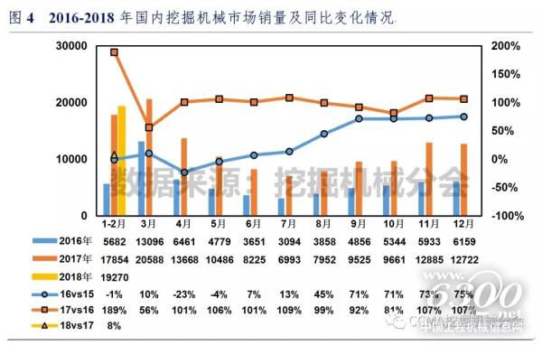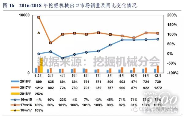 中國挖掘機械市場自2016年下半年進入高速增長通道,9月至12月連續(xù)四個月漲幅超過70%,2017年增長勢頭更加強勁,全年銷量接近翻番增長。進入2018年以來,在高基數(shù)基礎上,行業(yè)保持穩(wěn)健增長態(tài)勢。