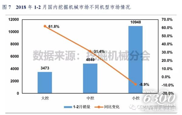 2018年1-2月國內(nèi)大挖、中挖、小挖銷量分別為3473、4849和10948臺,市場份額分別為18.0%、25.2%和56.8%。小于6噸的微挖和6~13噸范圍的小挖占據(jù)國內(nèi)約一半的市場份額。從不同規(guī)格產(chǎn)品銷量變化看,大挖、中挖和小挖銷量同比增加(負號表示減少)1326、1158和-1068臺,漲幅分別61.8%、31.4%和-8.9%。從近三年產(chǎn)品結構變化看,大挖、中挖復蘇顯著,小挖市場份額稍有下滑。