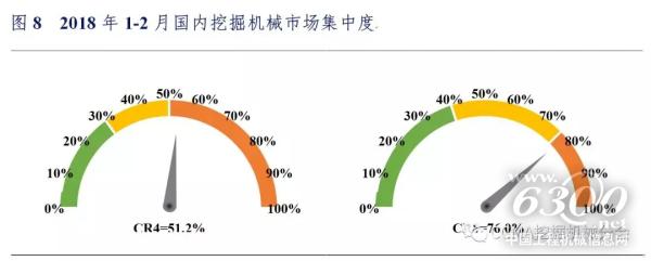 2018年1-2月國內(nèi)挖掘機械市場集中度CR4=51.2,CR8=76.0,相比1月市場集中度有所上升(前值CR4=50.2,CR8=75.2)。其中,大挖、中挖、小挖CR4市場集中度分別為57.5%、51.5%和50.7%,CR8市場集中度分別為83.2%、78.1%和77.0%。
