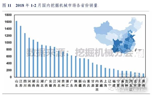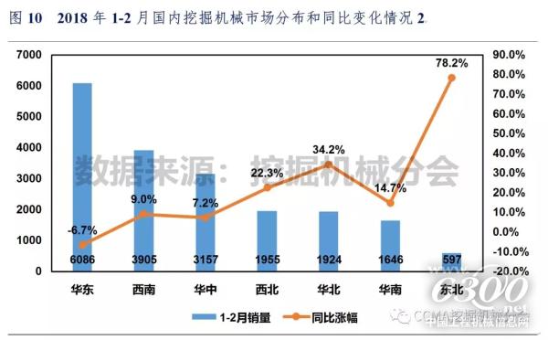2018年1-2月華東、西南、華中、西北、華北、華南和東北地區(qū)挖掘機械銷量分別6086、3905、3157、1955、1924、1646和597臺,同比漲幅分別-6.7%、9.0%、7.2%、22.3%、34.2%、14.7%和78.2%。