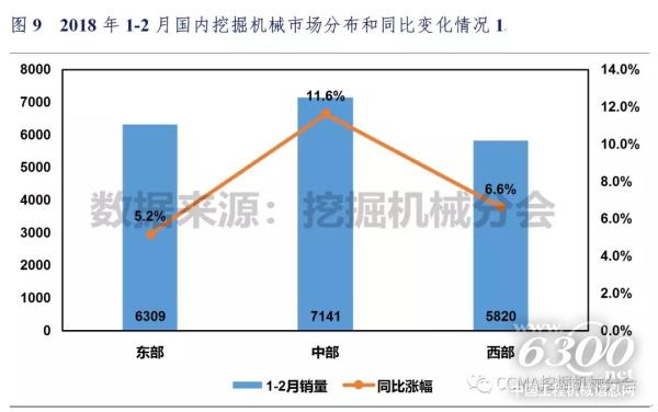 2018年1-2月東部、中部、西部地區(qū)挖掘機械銷量分別6309、7141和5820臺,同比漲幅分別5.2%、11.6%和6.6%。