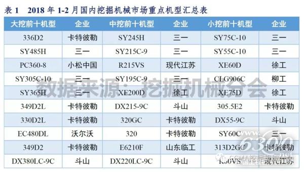 2018年1-2月,國內(nèi)不同規(guī)格挖掘機械銷量前十機型如下表所示。大挖市場主要被卡特彼勒、三一壟斷,國內(nèi)品牌在小挖市場的競爭力更強。