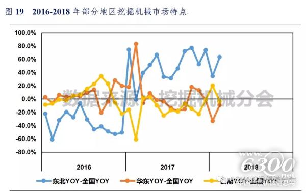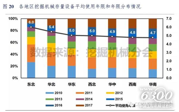 進一步考慮各地區(qū)存量設備壽命情況,2010-2017年銷量情況看,東北、華北地區(qū)舊機比例更高,挖掘機械平均壽命超過5年,因此,東北、華北的更新需求更為顯著,預計2018年東北、華北地區(qū)市場需求強度將超過全國平均水平。