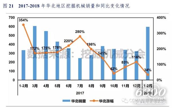 2017年環(huán)保部發(fā)布《京津冀及周邊地區(qū)2017-2018年秋冬季大氣污染綜合治理攻堅行動方案》,行動期2017年10月~2018年3月,該行動計劃對土石方施工造成一定影響,部分工程停工。從數(shù)據(jù)上看,2017年10月華北地區(qū)挖掘機械銷量漲幅出現(xiàn)大幅下滑,12月雖有所恢復,但依然低于2017年上半年水平。預計,隨著2018年4月,土石方施工解禁,加之北京-張家口冬奧會開始場館等設施建設,華北地區(qū)市場將有較大增長。
