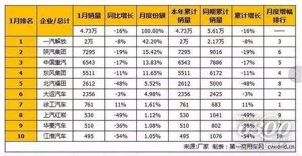 上表可見,1月份牽引車市場同比下滑16%,具體到1月銷量前十企業(yè)來看1增9降,和市場的趨勢高度吻合,僅徐工汽車一家企業(yè)實現(xiàn)增長。