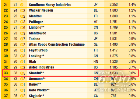 近日,2018年全球工程機(jī)械制造商50強(qiáng)排行榜(Yellow Table 2018)出爐。山推股份公司排名持續(xù)穩(wěn)步提升至33位,較去年相比又提升5位,成為國(guó)內(nèi)上榜企業(yè)中排名上升幅度較大的企業(yè),實(shí)現(xiàn)在全球行業(yè)激烈競(jìng)爭(zhēng)環(huán)境下的持續(xù)上升。