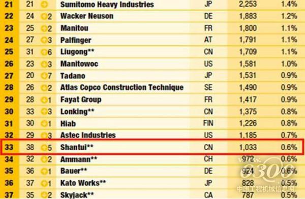 近日,2018年全球工程機械制造商50強排行榜(Yellow Table 2018)出爐。山推股份公司排名持續(xù)穩(wěn)步提升至33位,較去年相比又提升5位,成為國內(nèi)上榜企業(yè)中排名上升幅度較大的企業(yè),實現(xiàn)在全球行業(yè)激烈競爭環(huán)境下的持續(xù)上升。