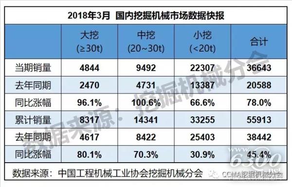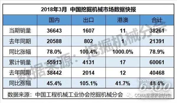 2018年3月,共計(jì)銷售各類挖掘機(jī)械產(chǎn)品38261臺,同比漲幅78.9%。國內(nèi)市場銷量(統(tǒng)計(jì)范疇不含港澳臺)36643臺,同比漲幅78.0%。出口銷量1607臺,同比漲幅100.4%。